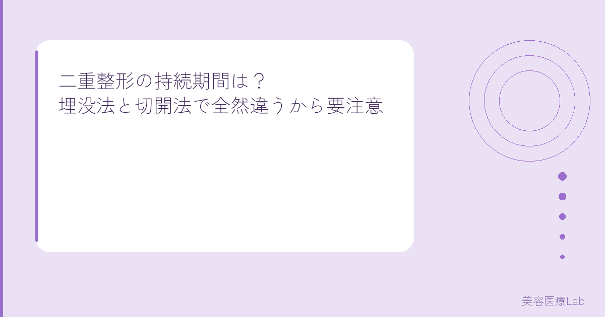 二重整形の持続期間は埋没法で3〜5年、切開法で半永久的。ライフスタイルや予算に合わせて選んでね。まずは複数のクリニックでカウンセリングを受けて比較するのが失敗しないコツだよ。
